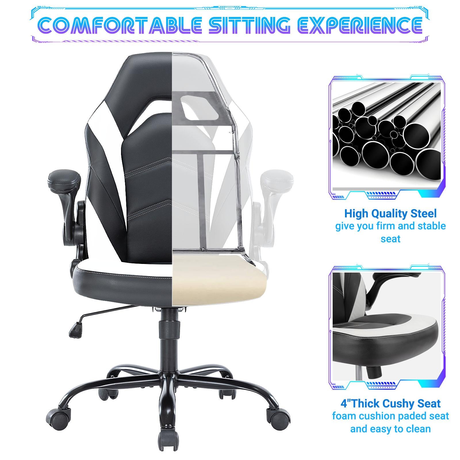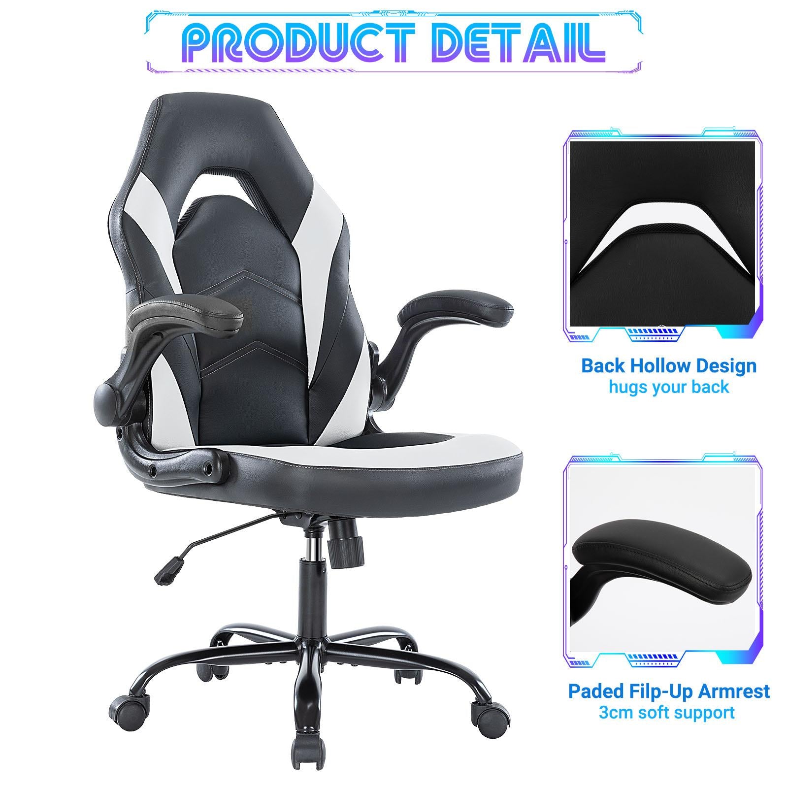 【Comfortable & Ergonomic Design】The gaming chair covered with premium PU leather is wear-resistant and easy to clean. Ergonomic lumbar support with a unique hollow design is breathable and comfortable for working or playing games for a long time. 【Thicker Cushion & Flip-up Armrests】The seat cushion of the computer chair filled with high-density shaping foam is thicker for different people. 90° flip-up armrests can be placed horizontally to support the arm. When the armrests are flipped up, the office chair can be easily pushed under the table. 【Rocking Function & 360° Swivel】The desk chair swings from 90° to 120° and brings you great comfort. The high-back computer chair has 360° smooth rolling wheels, that provide freedom of movement and convenience when rolling it in any direction. 【Any Occasion】The stylish desk chair is an ideal choice for gaming, working, studying, drawing, relaxing, and watching TV. Load capacity: 275 pounds. 【Easy Assembly】Our office gaming chair is equipped with all the hardware and necessary tools and it can be assembled in just 20 minutes. The stylish look of this computer gaming chair will add a touch of glamour to the interior of any room.