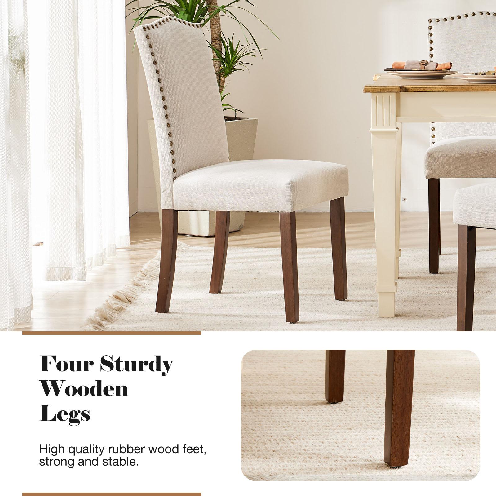 【Elegant Design】Thanks for their streamlined silhouette and sleek shape, make these dining chairs have an elegant modern style that's just right for your home decor. Plenty of decorative rivet inset around the cushion and back not only make it looks noble and elegant but also give the whole chair a feeling of exquisite luxury. 【Durable & Sturdy】The living room chairs are designed with heavy-duty rubberwood legs for optimum support to guarantee solidity and durability. The dining chairs are made of a wood frame with rubber legs in a walnut finish that can hold up to 250 lbs. Rubber feet on dining chair legs aim to prevent the floor from scratching. 【Excellent Quality】Our Dining room chairs have soft padded cushion seats covered in linen fabric which is breathable and comfortable, and easy to clean. Thick sponge filling of the backrest of the seat offers a comfortable sitting experience. 【Versatile Usage】The modern dining chair can be widely used for daily dining or special events like meetings, wedding banquets, and celebrations, as a side chair or dining chair in the dining room, living room, meeting room, hotel, restaurants, or any other ceremonial decorations. 【Easy to Assemble】The kitchen chairs come with installation instructions and all necessary hardware and tools. We also provide videos to help you get your bar stools installed in 10-15 minutes. If you have any questions about the product, please feel free to contact us.